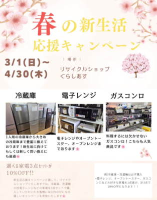 【お知らせ】家電入荷・引っ越しシーズン買取キャンペーン・店舗リニューアルなど今月のぐらしあす情報!